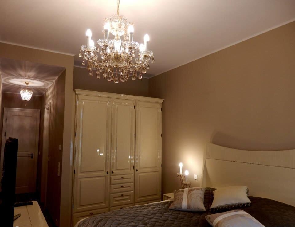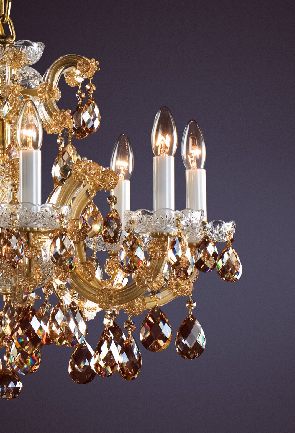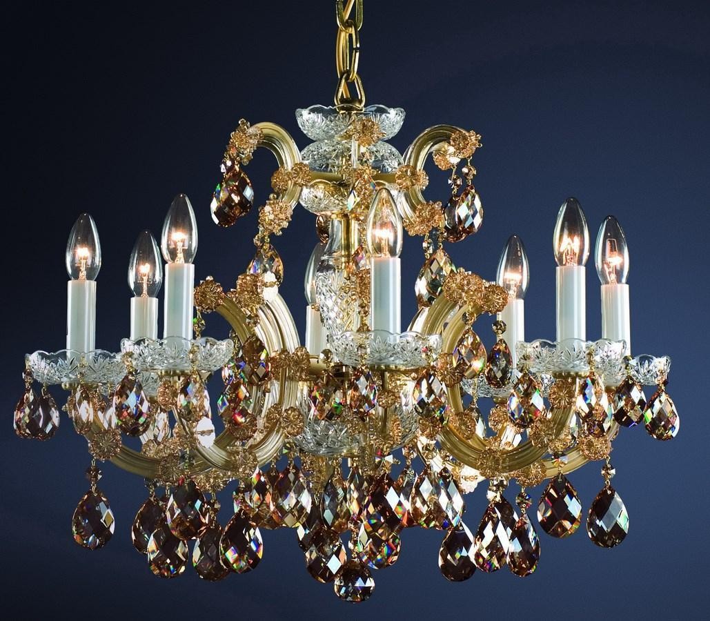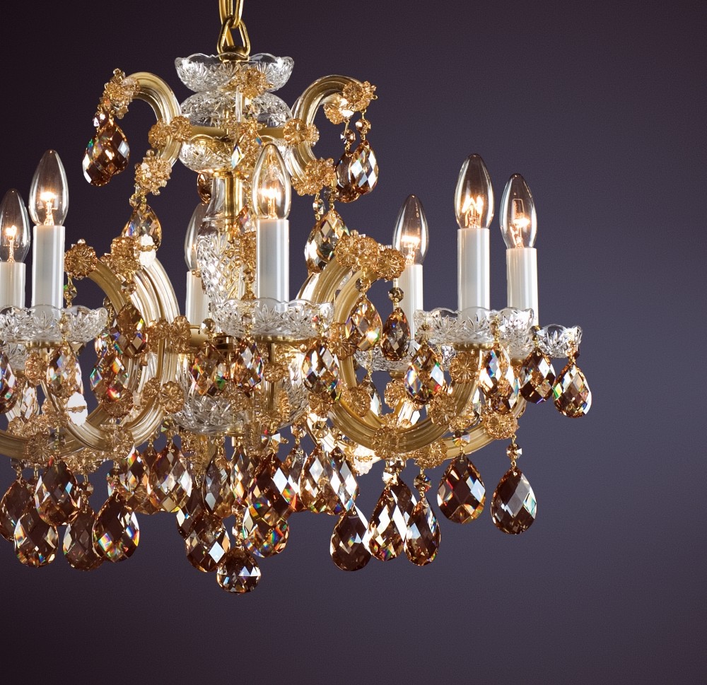 Produkcja klasycznych żyrandoli Marii Teresy rozpoczęła się w Czechach w XVIII wieku, wszystkie szklane elementy są wykonane ręcznie. Te szklane elementy o wysokiej zawartości ołowiu mają wysoką jasność i doskonałe rozproszenie światła. Ten luksusowy kryształowy żyrandol jest pięknie ozdobiony ciętymi kryształowymi zawieszkami i rozetami, które mają miodowy metalowy plater. Ten żyrandol polecamy nie tylko do klasycznych, ale także do współczesnych wnętrz. Nadaje się do salonów, teatrów, hoteli, pałaców z niskim sufitem. Występuje w wersji złotej.