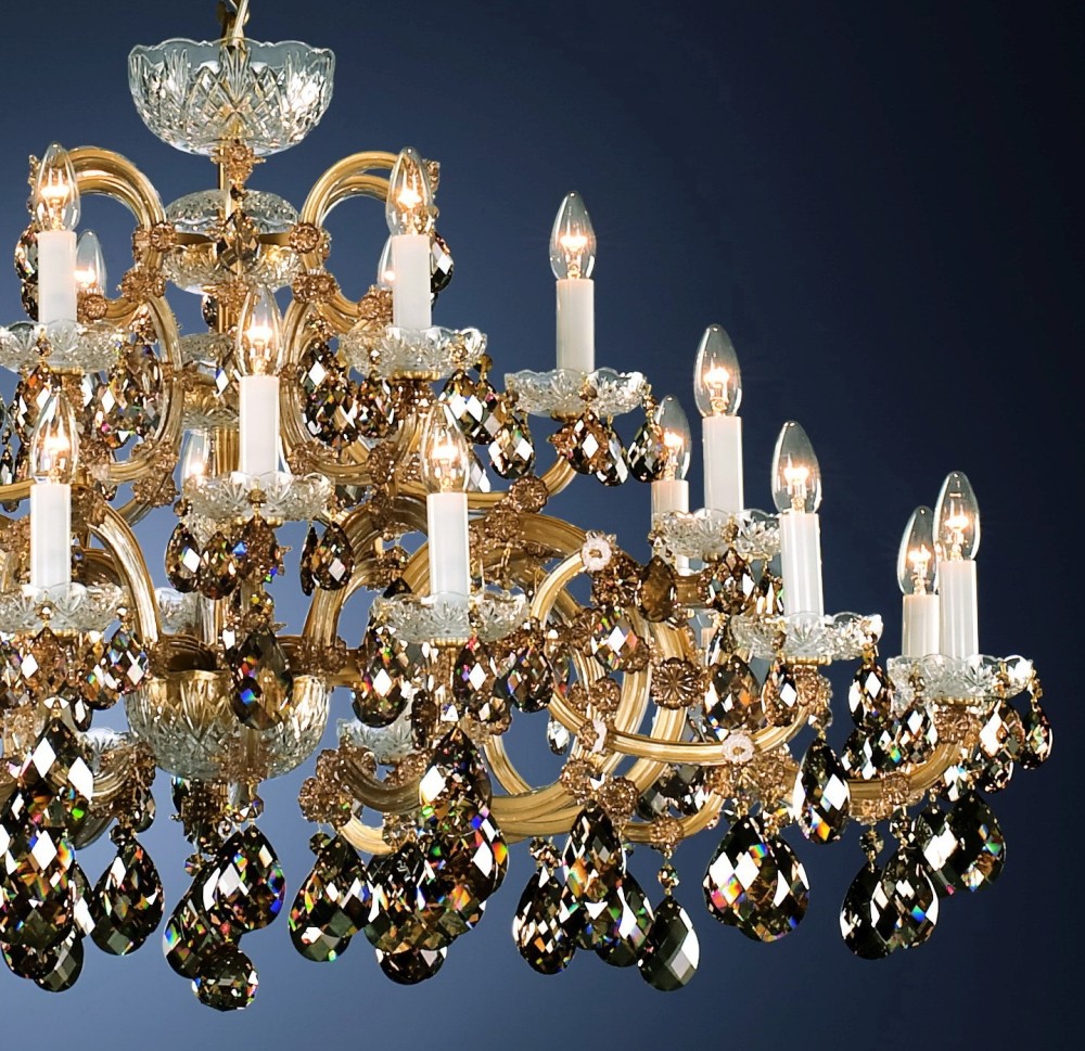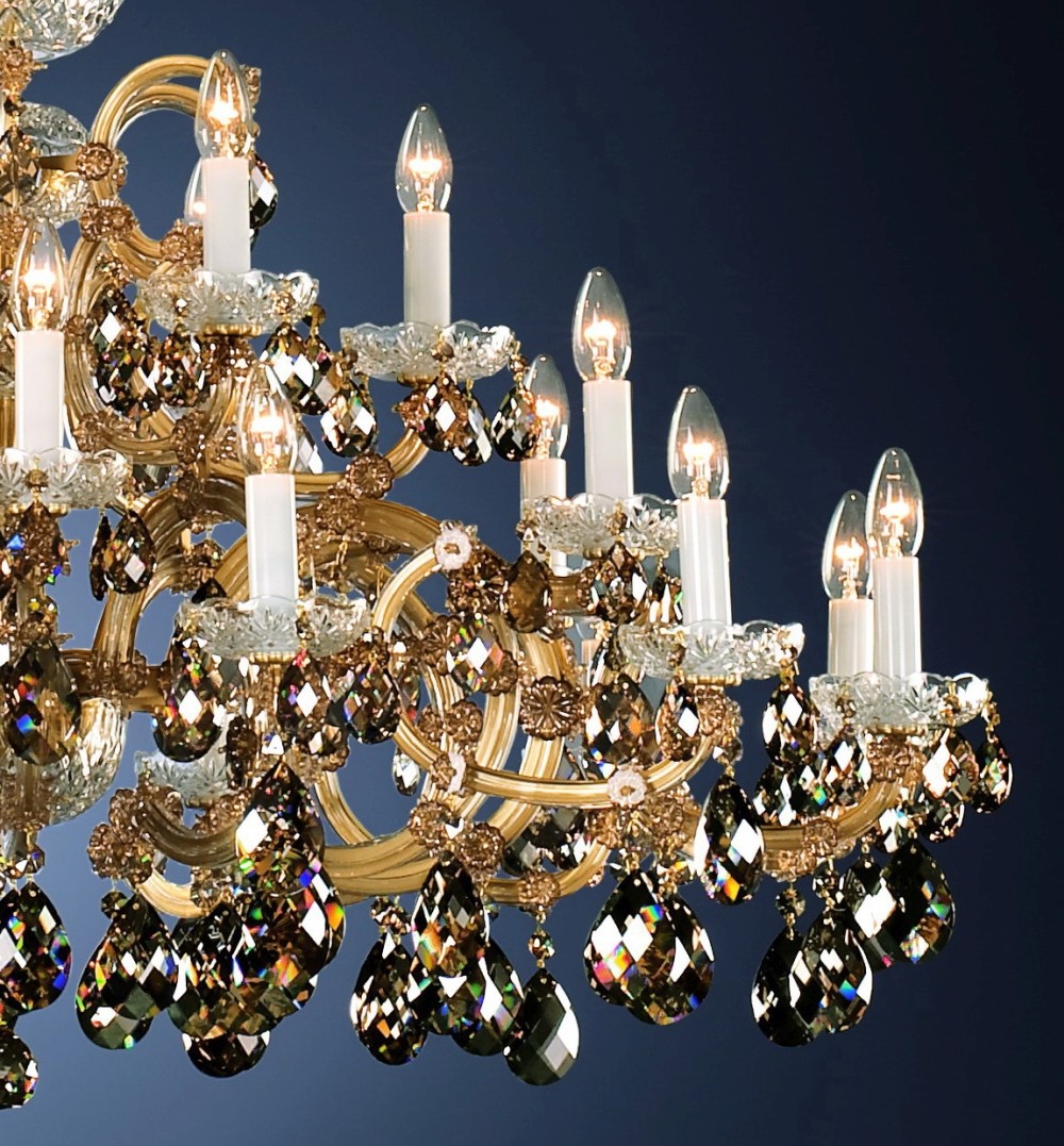 Produkcja klasycznych żyrandoli Marii Teresy rozpoczęła się w Czechach w XVIII wieku, wszystkie szklane elementy sa wykonane ręcznie. Te szklane elementy o wysokiej zawartości ołowiu mają wysoką jasność i doskonałe rozproszenie światła. Ten luksusowy kryształowy żyrandol z 24 ramionami jest pięknie ozdobiony ciętymi kryształowymi zawieszkami i rozetami, które mają miodowy metalowy plater. Ten żyrandol polecamy nie tylko do klasycznych, ale także do współczesnych wnętrz. Nadaje się do salonów, teatrów, hoteli, pałaców.